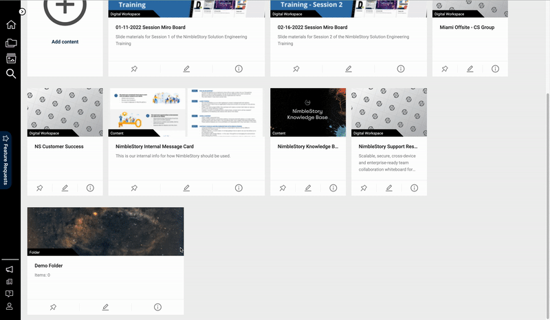 Folders can be added to your Project space, allowing your organization to create additional levels of structure. A folder can host any content or assets made available in NimbleStory. To learn more about them and other content, please visit /creating-and-curating-content/content-types-in-nimblestory#content-folders