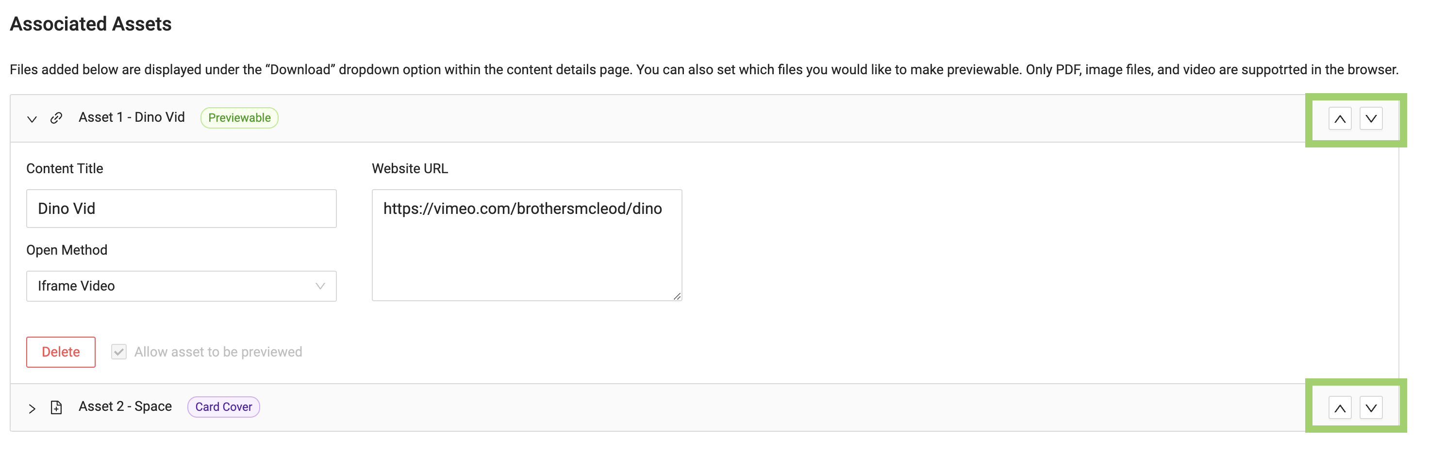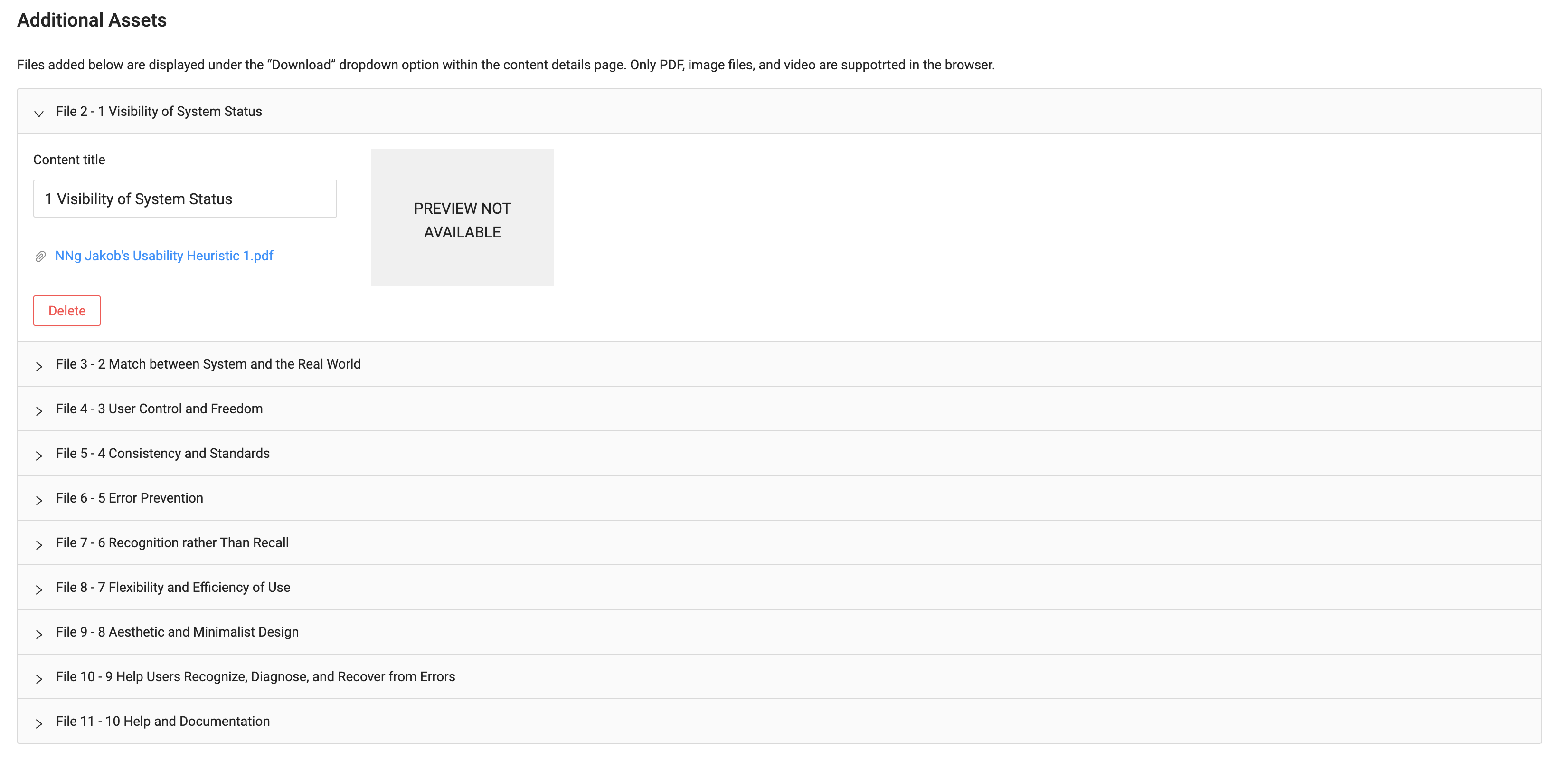 Additional assets can also be attached to a piece of content as well. By uploading files you will have the ability to update the name associated with them. Once attached they will appear in the dropdown download selector from within the content details view.