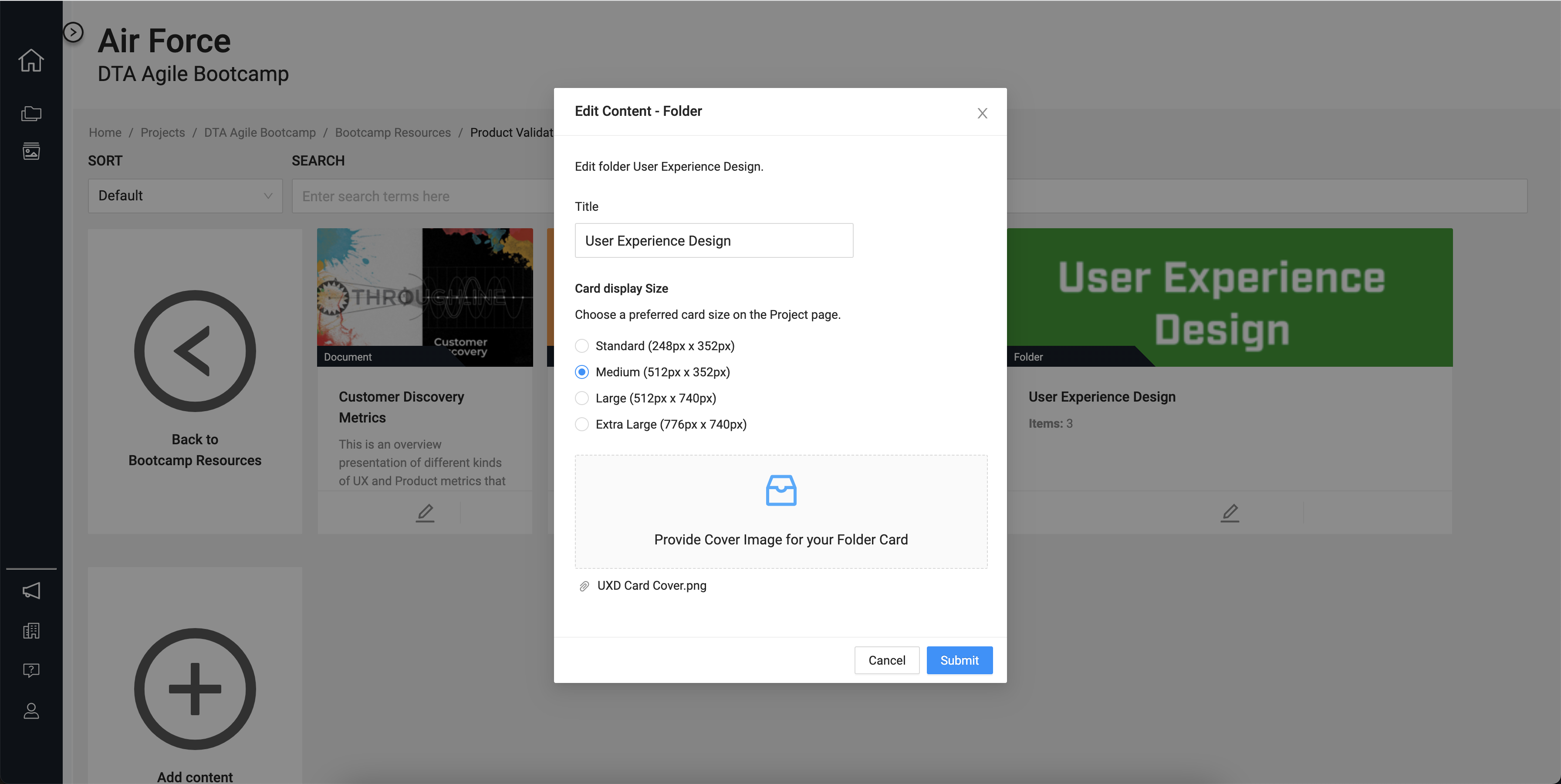 If you are seeking to update folder information you will simply be presented with a modal to update its contents. In it, you will be able to adjust the Title, Description, Display Size, and change the Card Cover.