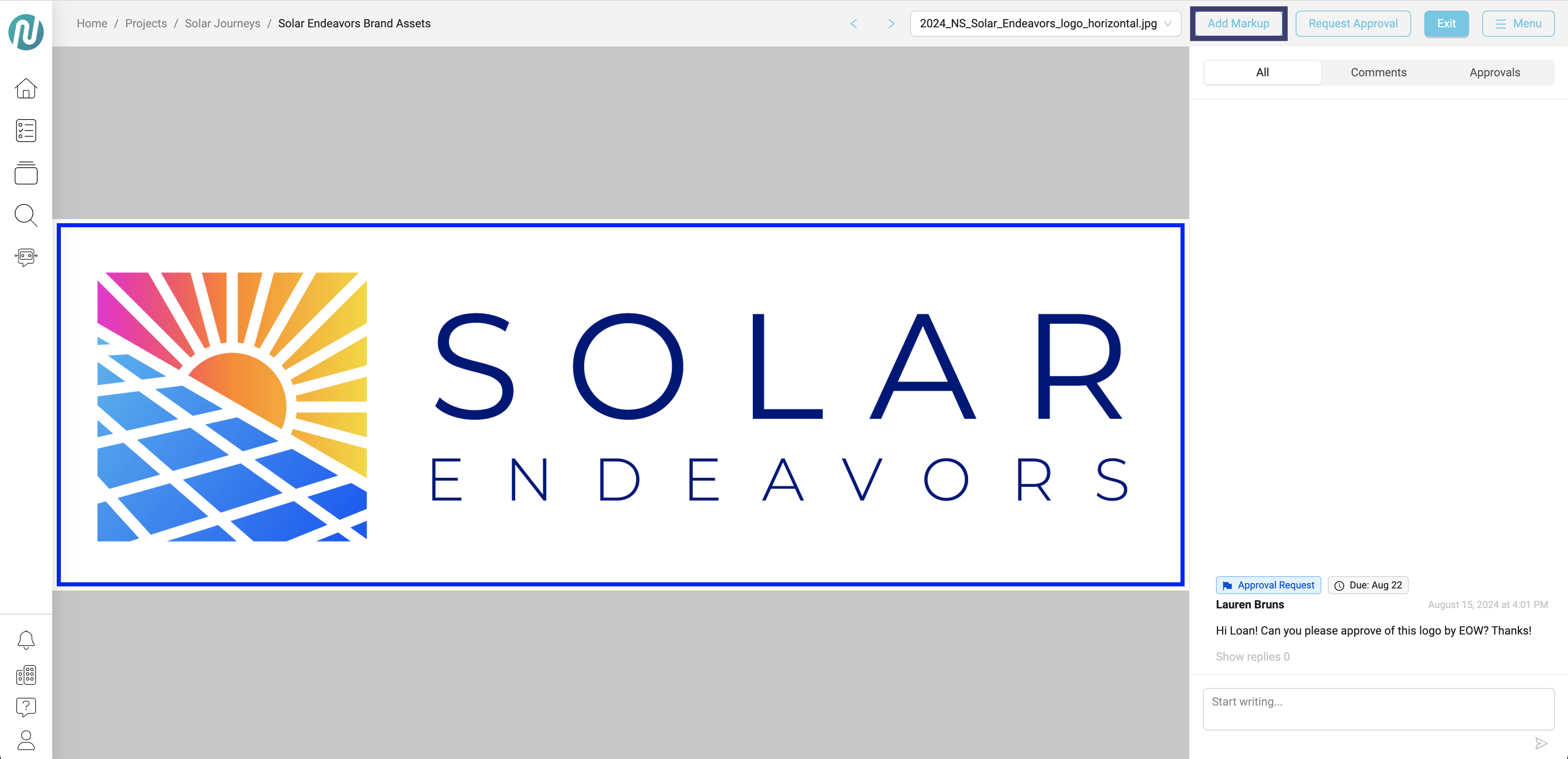 - The available markups will appear on the menu bar at the top and a blue ring will appear around the content where you can add your markups. When you select a markup option such as a circle (#4), you are able to draw a circle on your asset and use the control panel on the left to modify options for the circle.
