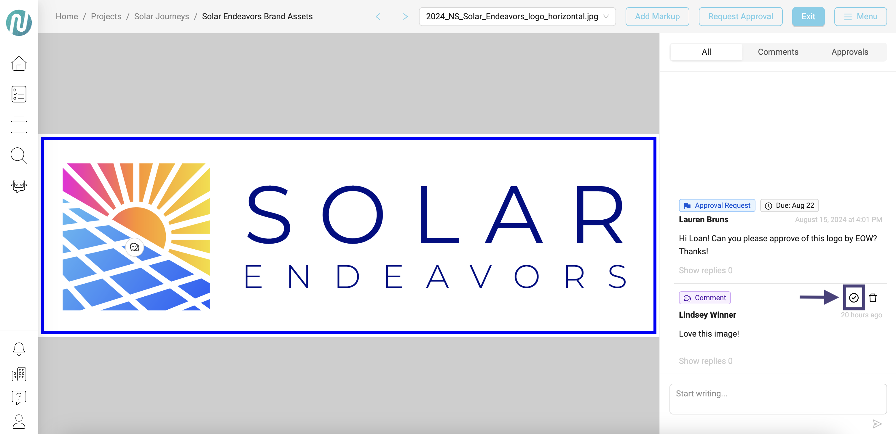- To resolve a comment, click on the check mark. It will turn green in the Review Log and, if it was a pinpoint comment, it will also show a green check mark within the comment, indicating that it has been resolved.