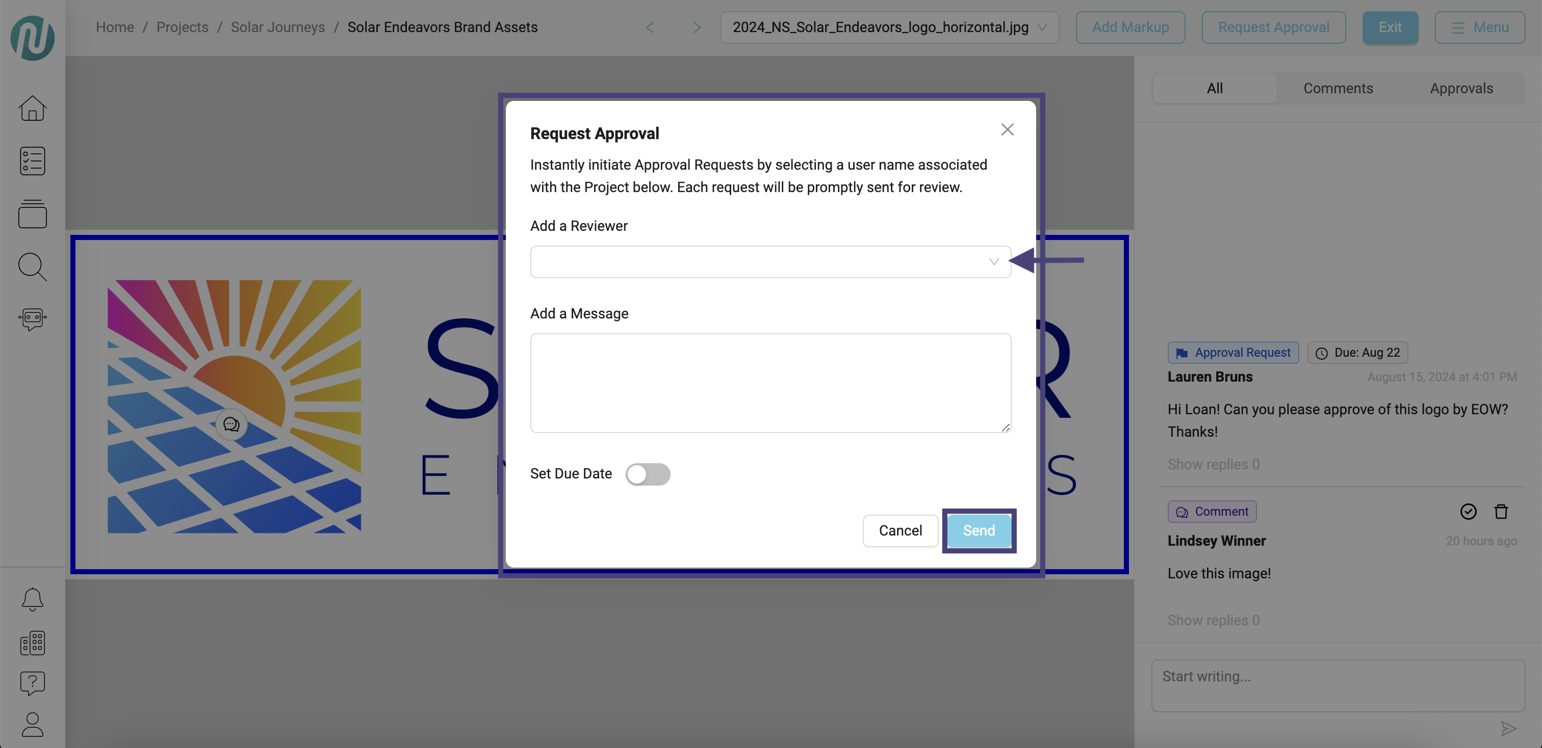 - When the Request Approval window appears, click on the down arrow in the box under Add a Reviewer to select a user. Then, fill in your message and choose a due date. Once you are finished, click on Send.