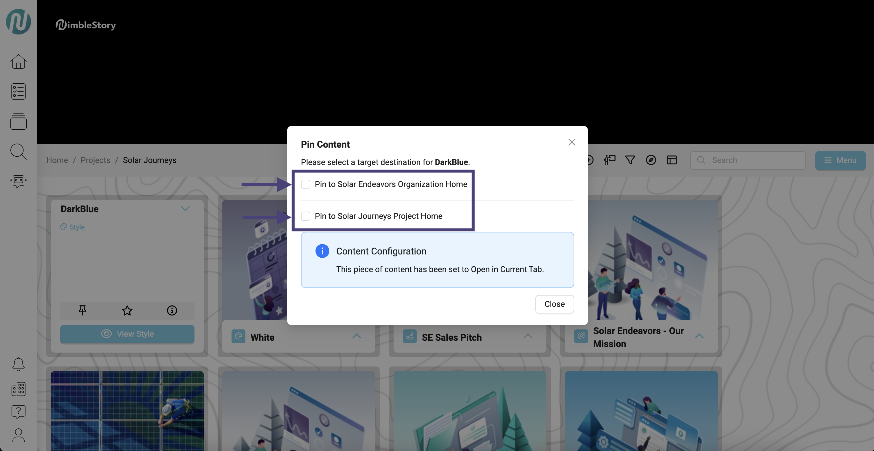 Project Administrators can now pin any content, solution, or external link card to a project. Pinned items will appear at the top in a new card format. This article provides step-by-step guidance on how to pin content.