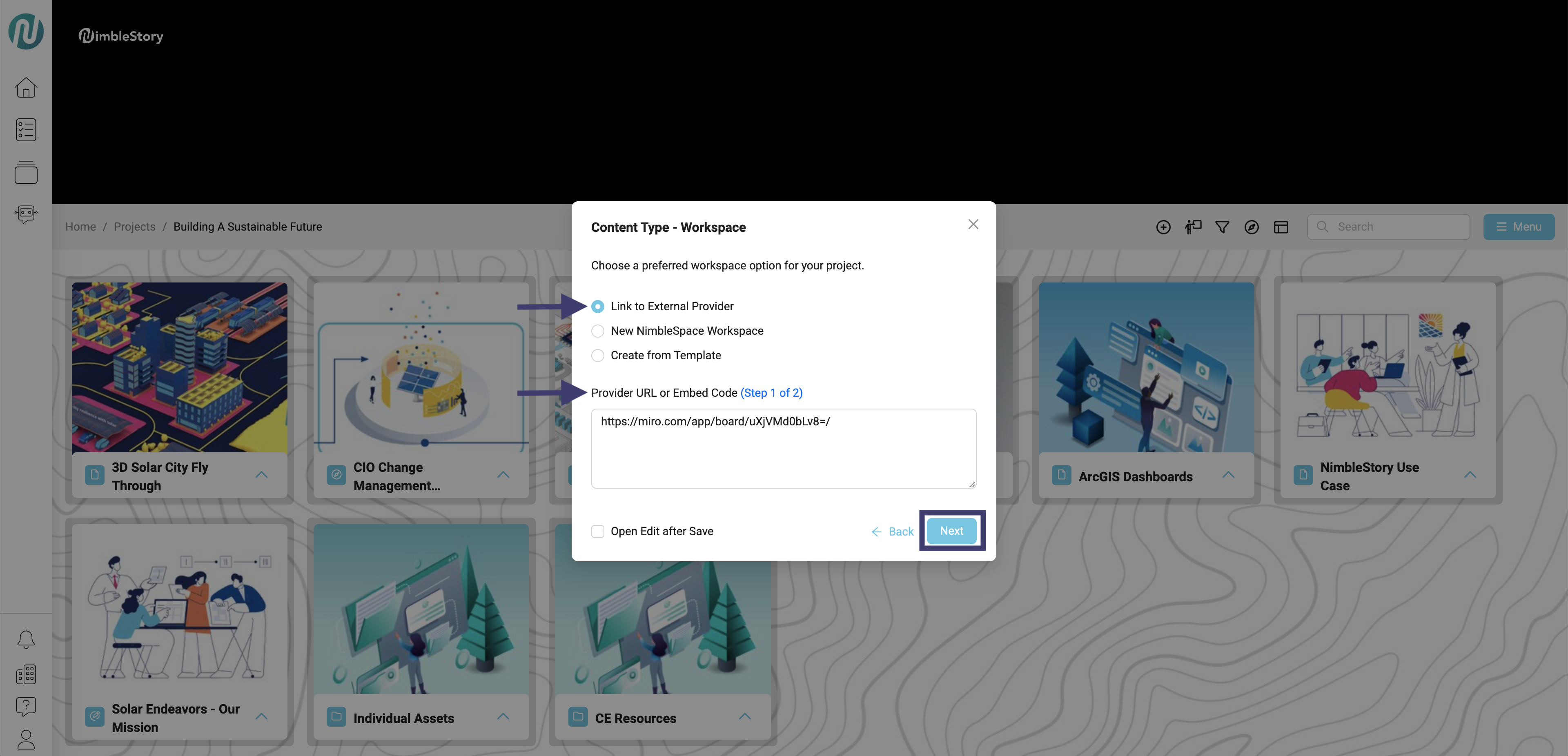 After pasting the URL or Embed Code, click Next.